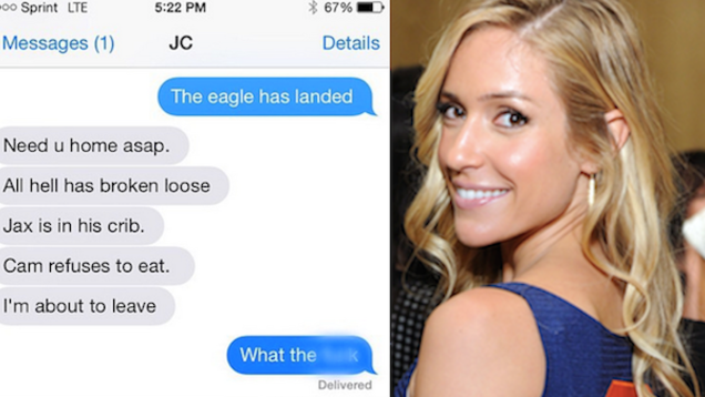 Jay, unfortunately, seems none too happy with the arrangement. On Instagram, Kristin revealed a recent text conversation with her husband, who begs, "Need u home asap" and threatens, "I'm about to leave."