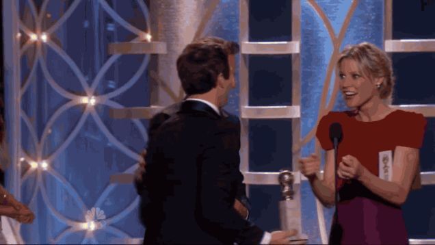 If you're nominated for a Golden Globe, write a speech. Just write a speech! And also, hope that Modern Family's Julie Bowen isn't presenting, because she'll whisper sweet nothings at you before mouth-kissing you: